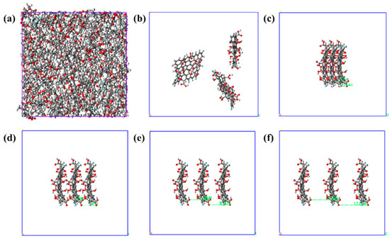 Molecular models. (a) Unfilled F-EP. (b) F-EP with disorderly filled FGO nanosheets. Figure (c) to (e) are the F-EP composite models with ordered filling of FGO (epoxy resin molecules are hidden). The layer spacing of each model is as follows: (c) 3 Å, (d) 6 Å, (e) 9 Å, (f) 12 Å.