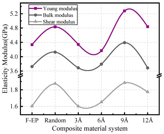 In this study, the static elastic modulus of each model at 300 K is calculated, and the results are shown in Figure 3. It can be found that when the interlayer spacing is changed from 3 Å to 12 Å, the mechanical properties of the material show a sinusoidal-like behavior of first decreasing and then increasing. When the spacing between FGO layers is 9 Å, the static elastic modulus of the composite reaches the highest, and it can be considered that the comprehensive mechanical properties of the composite are better at this time. It is considered that when the interlayer spacing is small, the structure distribution of the composite material is uneven, which cannot utilize the characteristics of high elastic modulus of modified graphene. However, when the interlayer spacing is too large, the van der Waals interaction force between FGO and epoxy matrix is weak, which leads to the weak deformation resistance of the system. After adjusting the distance between the layers, the modified graphene can fully contact with the matrix material and form a well dispersed adsorption layer. The external stress on the substrate can be effectively buffered in the adsorption layer and transferred to the modified graphene sheet with excellent mechanical properties. At the same time, the force of FGO on the matrix also limits the movement of a polymer molecular chain, which makes the epoxy resin form a relatively close cross-linking network. This can also better bear the stress of the material. Therefore, reasonable control of FGO filler network structure can improve the mechanical properties of the composites.