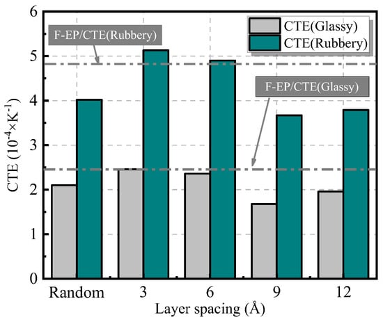 where V0 is the volume of the initial model after cross-linking (in this study, the volume parameter of the system at 300 K is used), and P is the standard atmospheric pressure. According to the formula (5), can be obtained by linear fitting the volume and temperature parameters of the model. Furthermore, the CTE of FGO/F-EP epoxy composites with different interlayer spacing can be obtained, and the results are shown in the Figure 5. It can be found that the overall CTE of the composite material system after adding FGO is lower than that of the pure resin system. However, when the distance between the FGO layers is near the range of 3 Å~6 Å, the filler spacing is too small, resulting in agglomeration. At this time, the filler lacks binding effect on the epoxy resin. As the temperature increases, the heated movement of the filler makes agglomerates expanded, which leads to a slight increase in the thermal expansion coefficient of the composite material. When the interlayer spacing of FGO nanosheets is about 9 Å, the two-dimensional nanosheets have a greater binding effect on the polymer segments and are not affected by filler agglomeration. When the composite material is thermally expanded, the segments preferentially fill the free volume space, so the thermal expansion coefficient of the system is small.