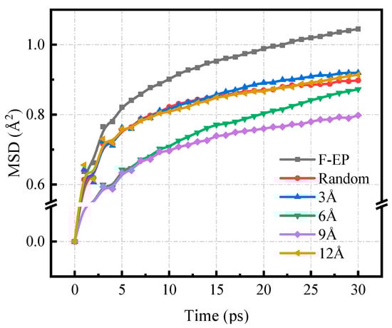 where N is the total number of atoms in the system, Ri(t)and Ri(0) respectively represent the displacement vector of the atom i in the epoxy system at time t and the initial time. This paper calculated the MSD parameters of the FGO/F-EP system with different interlayer spacing at 300 K, and the results are shown in Figure 9. It can be seen from the figure that the order of MSD of F-EP with different FGO distribution is 9 Å < 12 Å < Random < 6 Å < 3 Å, and this result is generally consistent with the trend of the FFV. The analysis suggests that the filler itself has an inhibitory effect on the movement of the epoxy resin molecular chain, but the excessively agglomerated filler has little effect on the matrix, which causes its effect on the epoxy molecular chain to be limited. After FGO is filled in order, a binding layer can be generated in the system through interaction force. At the same time, the fluorine-containing group can also bond with the epoxy matrix. The strong polar C-F bond also forms a certain barrier effect, and further guides the regular distribution of the resin matrix chain segments, thereby effectively reducing the MSD of the system.