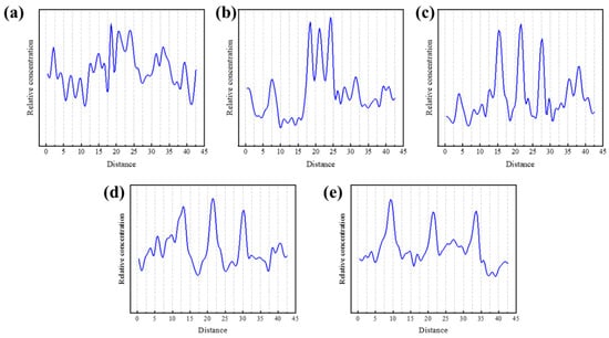 Axial density distribution of FGO/F-EP composites with different distribution characteristics. (a) Random; (b) 3-FGO/F-EP; (c) 6-FGO/F-EP; (d) 9-FGO/F-EP; (e) 12-FGO/F-EP.