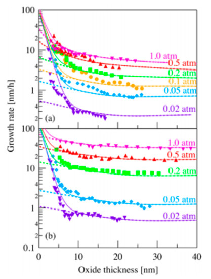 | Single crystals Si (100) | H2O/O2 (1 to 2000 ppm) | 780–980 | Linear parabolic | No data [62] |