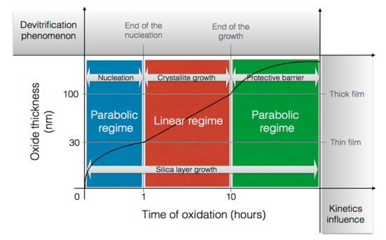 - The oxidation behavior becomes complicated when the crystallization of amorphous silica takes part in the oxidation process. This reduces the oxidant transport and leads to the decrease of oxidation rates.