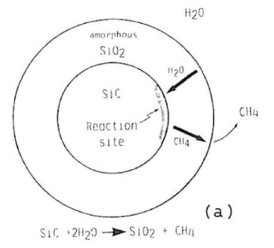 | 500 °C | SiC + 2 H2O → SiO2 + C + 2 H2 SiC + 2 H2O → SiO2 + CH4 O2 + CH4 → CO2 + 2 H2O | SiC + 2 H2O → SiO2 + C + 2 H2 SiCxOy + nH2O → SiO2 +xC + nH2 SiO2 + H2O → SiO32− + 2 H+ | SiC + 2 H2O → SiO2 + C + 2 H2 SiCxOy + nH2O → SiO2 +xC + nH2 SiO2 + H2O → SiO32− + 2 H+ |