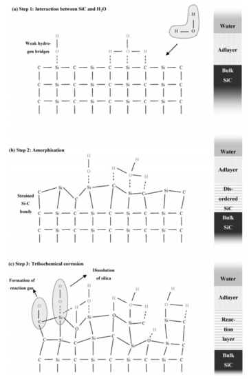 - Tribochemical corrosion: Simultaneously, silica dissolves in water, and, for low water-to-SiC ratios, it precipitates. Likewise, a cavitation-like wear phenomenon created by the release of gaseous compounds can cause the delamination of the layer.