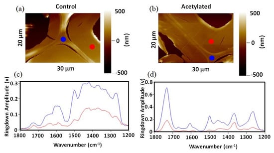 AFM topography images of (a) a control wood sample and (b) an acetylated wood sample, and their corresponding nanoIR spectra (c,d) at indicated locations. Reproduced with permission from [56]. Copyright Anasys Instruments (Now Bruker Corporation), 2012.