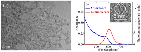 Transmission electron microscopy (TEM, JEOL JEM-2100 microscope, Tokyo, Japan) and high resolution TEM of single QD with mean diameter d = 3.5 nm are shown in Figure 1a and in the inset to Figure 1b, respectively. The results of spectroscopic studies are presented in Figure 1b, which show the absorption (blue curve) and photoluminescence (red curve) spectra of InP@ZnS QDs suspension. Blue curve refers to conventionally (no activation) prepared CQDs. The absorption spectrum exhibits the presence of excitonic bands of InP cores in the range 550–600 nm centered at ~575 nm. The band gap of InP@ZnS QDs was estimated to be 1.89 eV. The luminescence spectrum shows the symmetrical band peaked at 607 nm (red curve) typical for excitonic irradiation.