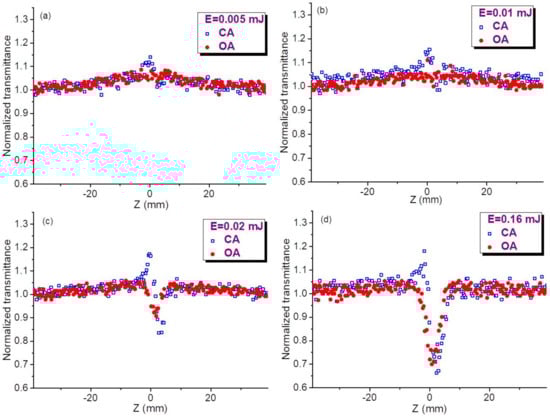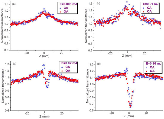 Based on above assumption, our further analysis of OA and CA curves using the fitting procedures of experimental data and theoretical approaches was carried out using the moderate energies of probe pulses (0.01–0.02 mJ).