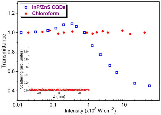 Optical limiting of 532 nm emission at different intensities of probe pulses. Red filled circles: intensity-dependent transmittance of chloroform. Blue empty squares: the same for InP@ZnS CQDs. Inset: dependence of scattered emission on the position of the 1-mm thick cell with regard to the focal plane of the focused probe pulses.
