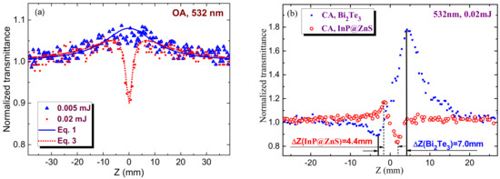 The definition of nonlinear refractive index of this suspension is a rather difficult procedure taking into account the necessity in determining the mechanism leading to this process. In Figure 5b, we show two CA z-scans, one corresponding to the data shown in Figure 2c for 3.5 nm InP@ZnS core-shell QDs (red empty circles) and another for Bi2Te3 nanoparticles suspension (blue filled squares). The latter species served for comparison of different mechanisms leading to the nonlinear refraction. The discussion and calculation of the nonlinear refractivity will be presented in Section 6.