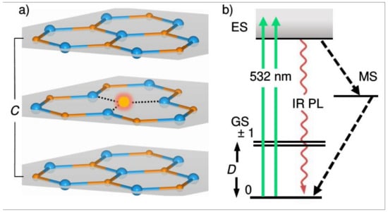 Extensively studied in three-dimensional (3D) crystals characterized by sp3-hybridized atoms, such as diamond and silicon carbide, defects possessing spin-dependent optical recombination have only very recently been found in hexagonal boron nitride (hBN), which is a 2D van der Waals (vdW) material formed by the atomic planes of sp2-hybridized atoms, interconnected through van der Waals forces [20,21,22,23]. hBN is the ultra-wide (UW) bandgap (≈6 eV) material [24] which can host a large variety of atomic impurities (or point defects), which give rise to optical transitions, well below its bandgap [25]. These properties combined with the possibility to create atomically thin 2D layers due to the weakness of the interlayer coupling in vdW materials allow for the study of the properties of spin-related phenomena at the limit of the condensed state of matter. While spin-dependent optical recombination and optically detected magnetic resonance has been observed for several types of defects in hBN [20,21,22,23], so far only one defect was rigorously identified, and its microscopic structure was established by means of electron spin resonance (ESR) and optically detected magnetic resonance (ODMR) [21]. This defect is the negatively charged boron vacancy (), a missing boron atom having three equivalent nitrogen atoms as the nearest neighbours, as schematically shown in Figure 1a. This defect forms a spin-triplet (S = 1) ground state (GS) which is characterized by the zero-field splitting value D = 3.5 GHz [21,26,27]. Optical excitation with green light induces a pronounced near-infrared photoluminescence (IR PL) and leads to a predominant population of the ms = 0 spin sublevel through the spin-dependent recombination pathway via the metastable state (MS) in its excitation-recombination cycle. All the properties mentioned above are summarized in Figure 1b. Together with pronounced spin coherence properties [28], this defect is currently considered to be a very promising candidate for quantum technologies.