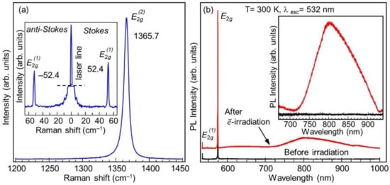 Since the Raman spectra of the initial and electron-irradiated samples have very similar characteristics, Figure 2a shows only the Raman spectrum of the irradiated sample. A single peak at a frequency of 1365.7 cm−1 with a full width at half maximum (FWHM) of about 8 cm−1 originates from the in-plane symmetry phonon mode of hBN. The insert to Figure 2a shows two ultra-low-frequency lines at −52.4 cm−1 (anti-Stokes) and 52.4 cm−1 (Stokes) with a FWHM of about 1.3 cm−1, which originate from the interlayer shear symmetry phonon mode of hBN. No other lines were observed in the 5–2000 cm−1 range for the reference nor for the electron irradiated hBN samples. It may be concluded that the Raman spectra presented in Figure 2a are typical for a crystalline hBN without any inclusions [37]. It must be noted that the state-of-the-art crystalline quality of hBN differs significantly depending on the manufacturer. The best crystalline perfection is expected for crystals produced by the National Institute of Materials Science (NIMS, Tsukuba, Japan) (FWHM of Raman High-frequency line is 7.1 cm−1); the perfection of single crystals produced by HQ Graphene is lower but is still of a high grade (FWHM of High-frequency line is 8.2 cm−1) [37].