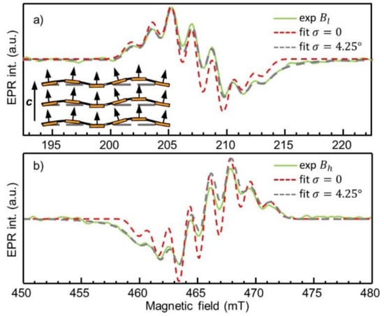 Attention must be drawn to the experimentally observed line shapes of the and shown in Figure 4a,b in the enlarged scale. These lines are stretched along the field axis towards the triplet spectrum center of gravity. This observation cannot be described only by taking into account the 47 MHz hyperfine interaction, as can be seen from corresponding simulations presented in Figure 4a,b. Namely, while the constant A = 47 MHz describes positions of the hyperfine-structure lines reasonably well, the relative intensities of the hyperfine lines together with the asymmetry of the fine-structure ESR lines are not satisfactorily reproduced. Broadening mechanisms, such as unresolved ligand hyperfine interactions [32,40] and the presence of local strain (or local magnetic) fields inducing a significant deviation in -factors [41] and D values [32,42] from their ideal (theoretical/canonical) values, are not appropriate to explain the observed line shape, since all these mechanisms do not lead to the asymmetry of the ESR line.