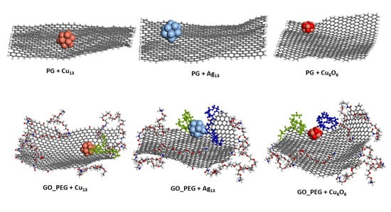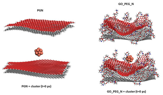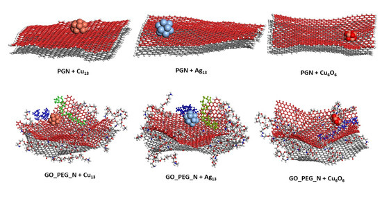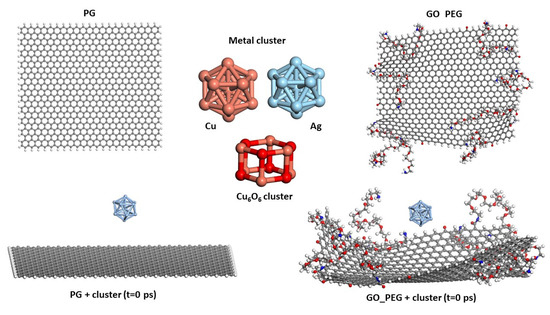 The starting configurations used for the production trajectories are shown in Figure 1 (graphene monolayers) and Figure 2 (nanoplatelets). A basal graphene sheet with a width of 46.5 Å and a length of 56.2 Å was used for all structures. To build these starting structures, all the systems were subjected to an annealing procedure composed of NVT MD simulations and further steepest descent and conjugate gradient energy minimization cycles at each temperature. This annealing procedure allows exploring the conformational space for low-energy structures, which will be used as starting configurations, by periodically increasing and then decreasing the temperature (from 300 up to 1000 K) of a classical dynamics trajectory, to avoid trapping the structure in local energy minima. For the sake of comparison, PG, PGN, GO_PEG, and GO-PEG_N were constructed. The PEGylated structures were functionalized with eight short chains of PEG (degree of polymerization n = 10). In the interest of saving computational time, only two layers of graphene were used to model the nanoplatelets. In the PEGylated nanoplatelets, both layers had the same grafting density, i.e., the number of PEG chains attached to the edges of the individual GO layers. In these starting structures, the mean final distances between the basal planes of graphene were 3.7 and 6.9 Å for PGN and GO-PEG_N, respectively. The clusters used to represent the metal nanoparticles were composed of thirteen atoms arranged in an icosahedral shape. This number was chosen because of the well-known stability of this regular icosahedron geometry for Cu and Ag nanoclusters [55,56]. For CuO nanoparticles, a Cu6O6 cluster consisting of two hexagonal layers, one above the other, was chosen. This structure was found to be stable by a density functional theory calculation [57]. No constraints were imposed on the systems, so that all molecules could move freely over the whole simulation length. At the beginning of the calculation, the clusters were placed far from the surfaces, at distances of about 8 Å, as can be seen in the lower part of both Figures, and they were left to evolve with time.