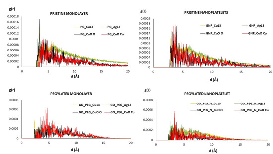 The radial distribution functions (RDF) of clusters and graphene-based surfaces are shown in Figure 3. These plots give us an idea of the spread of distances between the clusters and surfaces. All plots present maxima between 2.5 and 5–6 Å, and there are no large differences between the different models. It must be noted that the mean equilibrium distances shown in Table 2 represent distances between the cluster and nearest surface atoms, which must not necessarily coincide with maxima in Figure 3. In the case of the Cu6O6 cluster, the plots corresponding to the Cu atom (shown in red) are slight shifted to larger values, which is in accordance with the results shown in Table 2. Figure 3 also shows that in the PEGylated systems, distances are somewhat smaller.