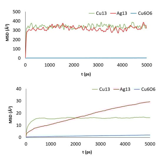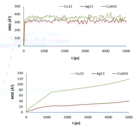 The MSD values corroborate the trends followed by the adsorption energies: the more dynamic the cluster is, the lower the adsorption energy. In agreement with our results, Gervilla et al. [79,80] studied the diffusion of Cu and Ag adatoms and clusters on graphene, using ab initio and classical molecular dynamics simulations. They found clusters diffused by a super-diffusive mechanism (α > 1 in Equation (3)), which is characterized by a continuous displacement of the clusters over the graphene surface without being trapped by adsorption sites. They attributed this behavior to a flat potential energy landscape on the surface, which facilitated the cluster diffusion. Manade et al. [74] estimated the diffusion energy barrier of Cu and Ag adatoms on graphene and arrived at the same conclusion.
