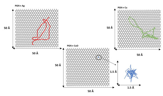 To show more clearly the cluster movement, the diffusion trajectories of the cluster center of mass over the graphene surface during the last 250 ps of simulation length for both PG and PGN are displayed in Figure 8 and Figure 9, respectively. Some video representative of the different cluster dynamics is included in the Supplementary Materials (Videos S1, S2, and S3).