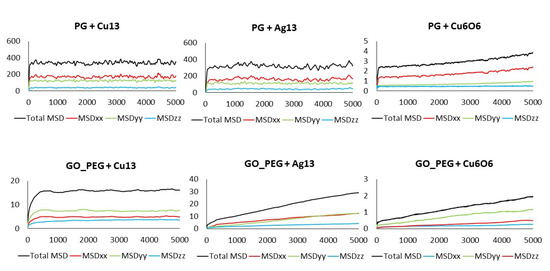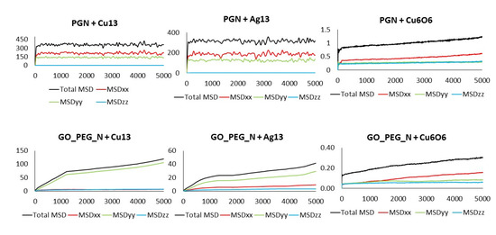 Cu13 and Ag13 clusters interacting with the pristine materials present the highest MSD values. Both PG and PGN weakly attract both clusters, which keep constantly moving over the material surface. However, the functionalization of the graphene layers drastically reduces their mobility (see bottom plots in Figure 6 and Figure 7). The PEG chains act by trapping the clusters and blocking their displacement over the surface. The Cu6O6 cluster shows a completely different behavior as its MSD values are low (blue line plots) in both the pristine and functionalized materials.