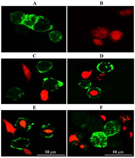 Phagocytic cells are a part of the immune system characterized by plasticity and heterogeneity. We tested whether GNPs and GOFs could enhance ovarian cancer SKOV-3 cells killing using BMDMs as effector cells and the SKOV-3 cells as target cells. Fluorescent dye eFluor 670–labeled SKOV-3 cells were used as target cells and incubated with BMDMs cells as effector cells at a ratio of 2:1 effector: target (E: T) cells in the presence of GNPs and GOFs at concentration 10 µg/mL. The BMDMs were stained with CD11b-FITC. Cells with dual colors were detected by confocal fluorescence imaging. First, BMDMs and SKOV-3 cells images were captured separately. Secondly, in the presence of GNPs and GNPs at a concentration of 10 µg/mL, red SKOV-3 cells were observed clearly inside the green-labeled BMDMs cells (Figure 3).