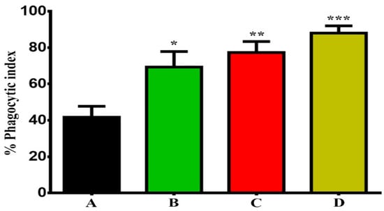 GNPs and GOFs increased the phagocytic index of cancer cells by BMDMs. (A) BMDMs engulfment of cancer cells. (B) BMDMs engulfment of cancer cells in the presence of GNPs at concentration 10 µg/mL. (C) BMDMs engulfment of cancer cells in the presence of GOFs at concentration 10 µg/mL. (D) BMDMs engulfment of cancer cells in the presence of both GNPs and GOFs at concentration 10 µg/mL. The data are represented as mean ± S.E.M. * p < 0.05, ** p < 0.01, *** p < 0.001 compared to the untreated BMDMs cells.
