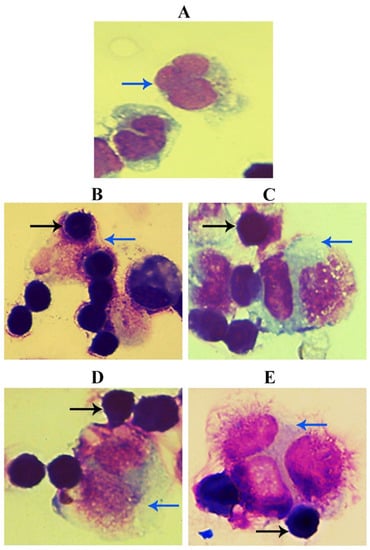 GNPs and GOFs increase the in vivo tumoricidal activity of macrophages. (A) Control untreated peritoneal macrophages. (B) Peritoneal macrophages injected with Ehrlich cancer cells. (C) Peritoneal macrophages injected with Ehrlich cancer cells in the presence of GNPs at concentration 10 µg/mL. (D) Peritoneal macrophages injected with Ehrlich cancer cells in the presence of GOFs at concentration 10 µg/mL. (E) Peritoneal macrophages injected with Ehrlich cancer cells in the presence of GNPs and GOFs at concentration 10 µg/mL. The blue arrow indicates macrophage cells, while the black arrow indicates Ehrlich ascites tumor cells. Magnification power 100×.