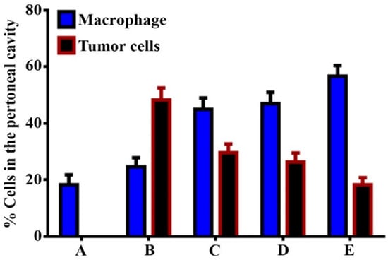 Percentage of the macrophages and tumor cells present in the peritoneal cavity. (A) macrophages cells in the control group. (B) macrophages cells and Ehrlich tumor cells. (C) macrophages and Ehrlich tumor cells in the presence of GNPs at concentration 10 µg/mL. (D) macrophages and Ehrlich tumor cells in the presence of GOFs at concentration 10 µg/mL. (E) macrophages and Ehrlich tumor cells in the presence of GNPs and GOFs at concentration 10 µg/mL. The data are represented as mean ± SEM.