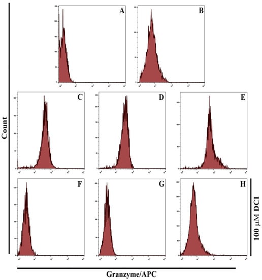 This study showed that the granzyme B was spread in the cytoplasm of splenic macrophages, as seen in Figure 8. Splenic phagocytic cells that are pre-treated with GNPs and GOFs exhibited more granzyme B signaling. Cytolytic enzymes are critical mediators of anti-tumor immunity. Combination of granzymes and perforin expressed by various immune cells alongside markers of αβ and γδ T-cell maturation is indicative of the immunological involvements. The expression of CD68 (Cluster of Differentiation 68, a protein) in macrophages, and the use of antagonistic, 3,4-dichloroisocoumarin (DCI), as protease inhibitors for granzyme, and degranulation process of the cytolytic granules, was confirmed for the antagonistic action of inhibiting cytotoxic activities of the chosen splenic macrophages. The granzymes trigger apoptotic pathways while perforin protects the mice against developing B-cell lymphoma and another carcinogens-induced sarcoma. The pathway can influence immunopathology, though, in an organ-specific manner, reduced antigen has been observed for malignant cells. Many alternate pathways can be involved; however, the immune cells’ effective pathway choice involves interferon-γ, perforin-granzyme, and FasL, a type-II transmembrane protein belonging to the family [44,45]. To investigate if granzyme B and perforin play an unimportant role in tumor cells’ killing mechanism, we used DCI as protease inhibitors to inhibit granzyme activities in the cytolytic granules’ degranulation process. The results show the ability of DCI to inhibit cytotoxic activities of splenic macrophages. The results showed very clear weak signaling of granzyme in GNPs and GOFs pre-treated macrophages in the presence of 100 µM of DCI.