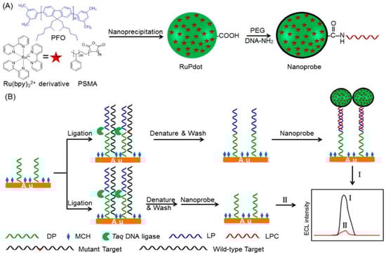 Schematic illustration of (A) the synthesis of a Ru(bpy)32+-doped Pdots nanoprobe using PFO as a carrier and PSMA as a functional reagent, and (B) the detection of SNPs with nanoprobe and ligase detection reaction. Reprinted with permission from ref. [106]. Copyright 2017 American Chemical Society.