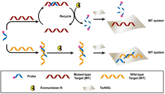 Nanomaterials have been extensively explored in the detection and diagnosis of pathologies in humans [124,125,126]. One such approach based on nanomaterials uses single or multilayered nanosheets made of transition metal dichalcogenide (TMD). TMD nanosheets have various features, including electronic, chemical, and optical properties [127]. A recent study has introduced Ta2NiS5 nanosheets as an amplification platform for SNP detection [128]. Dye-labeled DNA has been used as a probe to detect the mutant-type target. The ternary chalcogenide nanosheet presents selectivity for the specific oligonucleotides of various lengths by quenching the fluorescence of dye-labeled DNA probes. This methodology is highly sensitive to a single-base mismatch among the wild-type DNAs. Ta2NiS5 was used as the target amplification biosensing tool. A wild-type (WT) target was used to distinguish the SNP whereas, a dye-labeled DNA was used as a probe (P) for the identification of mutant type targets (MTs), as shown in Figure 3.