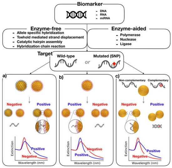 AuNPs stabilized with DNA have also been studied extensively for use in SNP detection. The single-base mismatch can easily be detected among the wild-type DNA fragments. AuNPs have expressed excellent results in liquid biopsies. DNA-coated AuNPs can discriminate the SNP in less than 10 min without the need for amplification. The NPs were incubated with the liquid sample, and the solution remained un-aggregated in the presence of the target sequence [137].