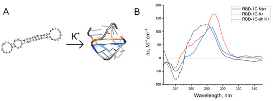 The structure of the aptamer RBD-1C was supposed by Song et al. [22]; it consists of two hairpins that are end-to-end stacked (Figure 1A). The RNA fold webserver [27] provided the same folding for the sequence of RBD-1C. DNA duplexes are known to have hyperchromic effect during unfolding in UV-spectra at the wavelength of 260 nm [28]. However, no notable changes in UV-spectra were tracked during RBD-1C melting in potassium buffer (Figure S6). Circular dichroism (CD) spectra were recorded to identify the other possible topologies of RBD-1C (Figure 1B).