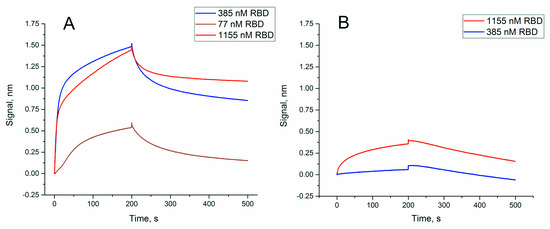 Sensorgrams of the interaction between soluble RBD of S-protein and immobilized oligonucleotides: (A) RBD-1C; (B) RBD-1C-sh. The concentrations of protein are provided in the graphs.