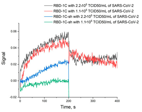 Thus, the unique spatial structure of RBD-1C is crucial for high affine recognition of the RBD of S-protein. Next, the ability of binding the whole virus was tested for both RBD-1C and RBD-1C-sh. RBD-1C showed excellent curves for both concentrations of the virus; whereas RBD-1C-sh provided low-efficient binding of the viruses (Figure 3). It could be concluded that the active aptamer structure is a DNA hairpin of RBD-1C, whereas G-quadruplexes are low-active additives. The content of the virus was estimated in TCID50 that corresponds to virulent particles.