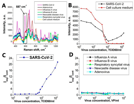 Detection of SARS-CoV-2. (A) SERS spectra of an experimental virus sample (SARS-CoV-2) at a concentration of 4.6 × 105 TCID50/mL; virus-free cell culture medium in the same dilutions and control viruses in the same concentrations. (B) The dependence of the peak intensity of 587 cm−1 on the concentration of SARS-CoV-2 and for the virus-free cell culture medium in the same dilutions. (C) Concentration curve for SARS-CoV-2. (D) Concentration curve for control viruses.