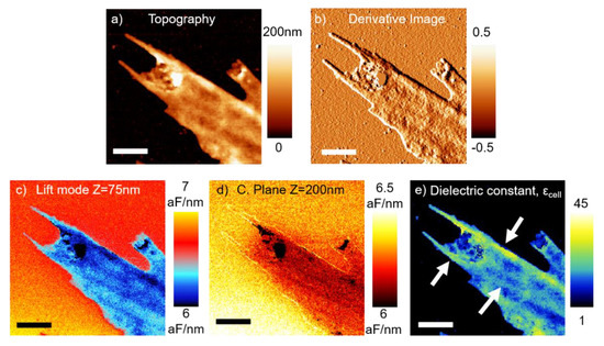 Figure 4 shows a higher resolution zoomed-in image acquired on a cell membrane extension of the cell in Figure 3. Figure 4a displays the topography of the zone highlighted with a yellow rectangle in Figure 3d. Here, we can see with greater detail one of the cytoplasmatic projections of the cell (presumably lamellipodia or filopodia, crucial for cell migration). Figure 4b is the consequent derivative image, where the edges of the structure are clearly highlighted. Already in the topographic image, some subsurface fibers (probably cytoskeletal actin filaments) seem to drive the structure of the cell elongation. Figure 4c,d shows the lift mode and constant plane SDM images of that zone, respectively. Again, the appearance of some contrast in constant plane images ensures for a distinct dielectric polarizability of the cell with respect to the electrolyte. Figure 4e displays the equivalent homogeneous dielectric constant map, where the zone with cytoskeleton fibers (some of which are marked with white arrows) appears to have a higher dielectric signal than the regions between fibers.