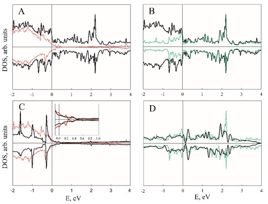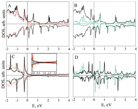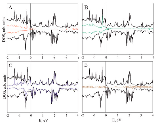 Figure 3, Figure 4, Figure 5 and Figure 6 illustrate the total (TDOS) and partial (PDOS) densities of states for the VP/ZnO composites in favorable configuration. As can be clearly seen from A and B parts of Figure 3 and Figure 4, the ZnO slab mostly contributes to the states in the valence zone while the conduction zone is formed predominately by VP film. Analysis of C and D parts of the same figures shows how the slabs affect each other in comparison with isolated ZnO and VP thin films.