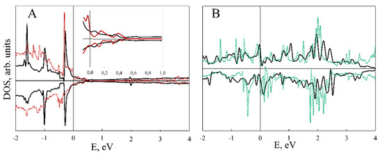 DOS for V4P4/ZnO composite. (A) Black and red lines correspond to TDOS of pristine ZnO slab and PDOS of ZnO fragment in V4P4/ZnO composite; (B) black and green lines correspond to TDOS of pristine V4P4 slab and PDOS of VP in the composite structure, respectively.