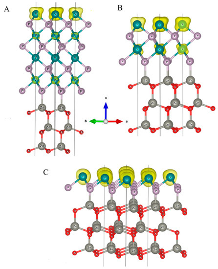 In addition, the charge and spin density distributions were analyzed. The negative charge on VP slab demonstrates the electron transferred to it from the ZnO slab (Figure 7).