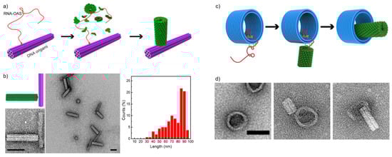 DNA origami-virus hybrids based on Tobacco mosaic viruses (TMV). (a) The in situ assembly process of TMV CPs around a TMV RNA strand anchored to a DNA origami platform [41]. The origin of assembly (OAS) sequence nucleates the growth of the nanotube. (b) Assembled TMV-DNA origami hybrids viewed with TEM. The graph on the right shows the length distribution of assembled tubes around a ~1910-nt long RNA. Scale bars are 50 nm. (c) The in situ assembly of a TMV rod nestled inside a DNA origami barrel [45]. The assembly is guided by pathing the RNA strand through multiple binding sites along the DNA origami and then releasing the bound RNA in a stepwise manner. The DNA origami barrel was a 23-helix bundle with a length of ~30 nm and an inner diameter of ~34 nm. (d) TEM images of the steps depicted in Figure 3c. Left: the DNA origami barrel with pathed RNA. Middle: CP rod assembly on the unbound overhang of the RNA. Right: A finished CP rod inside the hollow of a DNA origami barrel. Scale bar is 50 nm. (a,b) reproduced with permission from [41]. Copyright American Chemical Society, 2018. (c,d) reproduced with permission from [45]. Copyright American Chemical Society, 2020.