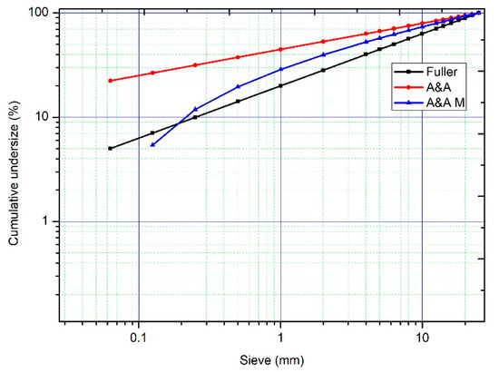 The Andreasen and Andersen model (A&A, A&A M) [16] changes the parameter of the Gessner parabola from r = 0.5 to r = 0.33–0.5 to achieve a higher degree of packing. In UHPC, a good packing level has been achieved with values of r = 0.23 [1]. The Fuller and Thompson model, modified by Gessner, does not establish an adequate densification for materials with particles lower than 250 µm, obtaining mixtures that are poor in cement content [17]. Conversely, the aforementioned A&A model establishes a curve up to the value of zero, with it not being limited to a minimum necessary particle size (Dmin). The modification of the A&A model (A&A M), established by Funk and Dinger [18], introduces the graduation of the curve and considers the minimum particle size (see Figure 1).