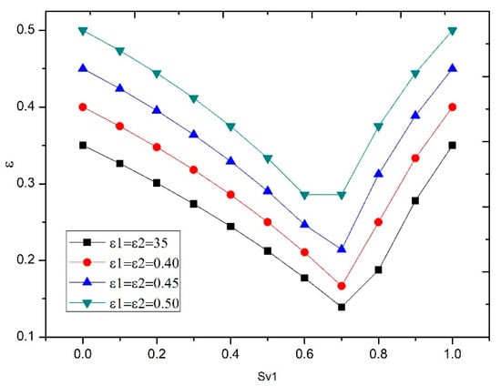 The first discrete packing model, which is valid for spheres, was Furnas’ binary model (1929), which, a year later, Westman and Hugill applied to multicomponent models [13,21,22]. In both models, there are two conditions: the first is that there is no interaction between the particles, and the second is that some particles enter the gaps left by the other particles. Furnas initially related the void index of the mixture (ε) with the void index of the components (ε1, ε2) and the volume fraction of component 1 in the mixture (Sv1). By choosing the higher value for Equations (4) and (5), this may be better understood through examination of Figure 2.