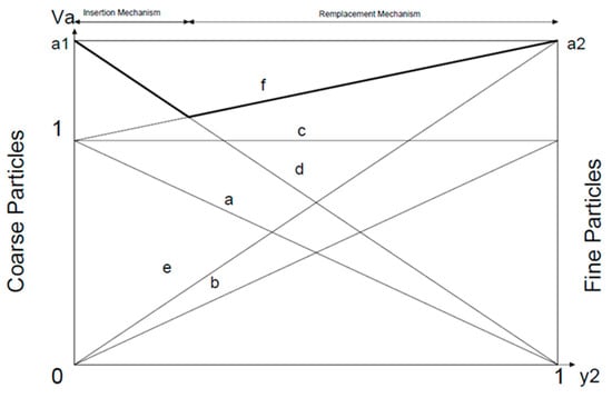 Westman and Hugill identified (see Figure 3) the apparent volume Va, the inverse of compactness “c”, as the volume necessary to obtain an absolute volume equal to unity, establishing a pore index “e” that meets Va = e + 1 = 1/c, with a1 and a2 being the apparent volumes of the coarse and fine particles, respectively, and “y1”, “y2” being the volume fractions of each class. In Figure 3, the lines “a” and “b” are represented, respectively, as the absolute volumes of the coarse and fine particles. It should also be noted that lines “e” and “d” denote, respectively, the apparent volumes of the fine and coarse particles. Line “c” represents the sum of absolute volumes of all particles equal to a value of one. Line “f” represents the binary mixture, establishing a turning point when the void index is lower and compactness is at a maximum. This line is composed of line “d” for coarse particles and line “f”. Therefore, should the mixture with the coarse particles be dominant, Equation (6) would be obtained and for mixtures with dominant fine particles, Equation (7) would be obtained. The best mixture corresponds to the highest value of both such equations or the lowest value of Equations (10) and (11), where “c” is the compactness. α1 and α2 correspond to the real compactness of each class and Φ1 and Φ2 are the volumes occupied by each class in the mixed volume.