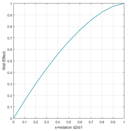 The first approximation to the wall effect was made by Caquot in 1937, indicating that the reduction in compactness of the smaller grains with size d2 around the thicker grains with size d1 results in a variation of volume proportional to the surface of the interface [23]. Caquot identified a linear relationship between 0 and 1 for the wall coefficient, b12 = x; (x = d2/d1). Authors such as Ben-Aïm established a disturbance zone in the contact between coarse and fine particles where a reduction in compactness occurred, depending on the level of insertion of the fine grains in the disturbance zone, an approximation that can be established is b12 = 2x. Therefore, for grain sizes with d1 = d2, the wall coefficient does not trend toward the value of one. Dodds provided a model for calculating the wall coefficient based on the theoretical model of hexagonal-close packing (HCP), with β = 0.74, where the tendency of the wall effect for d1 = d2 tends toward the value of one, obtaining values greater than one for values of x between 0.6 < x < 1. However, this model establishes a maximum packing, something that does not occur in reality, with the voids left being filled by particles that also meet the condition of full contact. The function that represents the wall coefficient indicated in the MLC was obtained empirically by means of the previously mentioned theoretical models; Equation (25) represents the wall coefficient of the MLC. This function was later adjusted until Equation (26) was obtained in the MEC. Figure 4 represents the function of the wall effect coefficient, tending to the value of one for d1 = d2.
