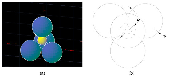 Packing of four spheres with diameter d1 and d2 = 0.224 d1. (a) 3D visualisation, and (b) vertical projection.