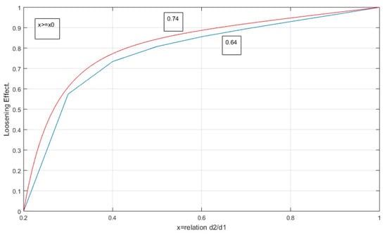 The loosening function embodied in the MLC is set out in the following equations, indicating that for a lower ratio of x0 < 0.2 the value of the coefficient is zero. Figure 6 represents the function of Equation (27), for random packing (β = 0.64) and HCP (β = 0.74), establishing an upper limit of 1 and a considerable increase in the distance coefficient between 0.2 < x < 0.3.