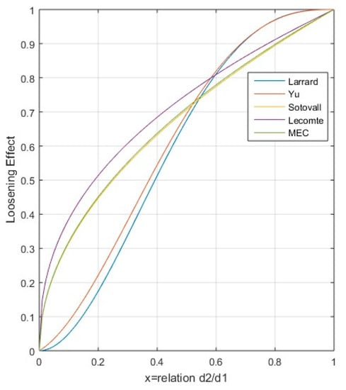Larrard [23,26,30] provided a function of the loosening coefficient according to empirical measurements. In this case, the hypothesis of a(0) = 0 and a(1) = 1 is maintained, though no null value is established for diameter ratios of less than 0.2, as indicated by Sotovall (though the horizontal tangent is established at 1 and 0). Equation (29) shows the function of the loosening coefficient proposed by Larrad. Other authors, such as Yu et al., established a function of the loosening coefficient with higher values for lower size ratios [23,31], with a similar trend to that indicated by De Larrard. Equations (29) and (30) establish, respectively, the functions of De Larrard and Yu.