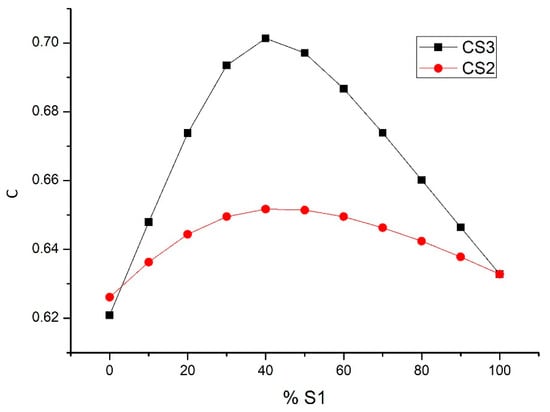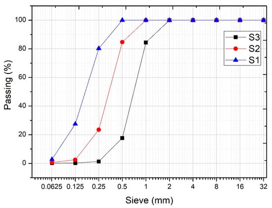 Initially, three aggregates with sizes S3 (0.5–1.6 mm), S2 (0–1 mm), S1 (0–0.5 mm) were used in the design of the granular skeleton. The experimental compactness, dry compactness and Ci of these aggregates were determined, with a compaction index of K = 9 that provided values of cS3 = 0.57, cS2 = 0.62 and cS1 = 0.56. The method used is that provided in LPC test no. 61 [35], with the variation through vibration being that indicated by Sedran [36]. By means of the MEC, the maximum compactness reached was analyzed as a function of the percentage of each aggregate. A greater degree of compactness was achieved in the mixture of aggregates S3-S1 with 60% of aggregate S3, achieving a compactness φS3−S1 = 0.70. For a better understanding of this procedure, see Figure 8, Figure 9 and Figure 10. In Figure 9, it can be seen that the use of the sands S3 and S1 present the highest compactness. This value is higher than that obtained with the mixture of the three sands.