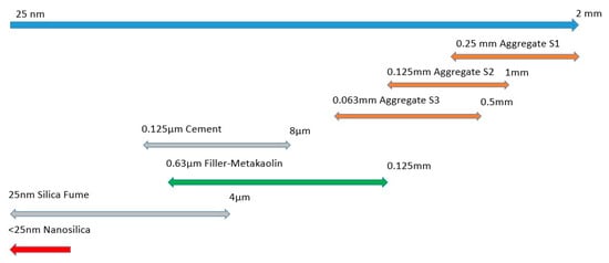 In order to increase compactness, additions with sizes lower than 100 µm were used (including cement). The additions used in the models were limestone filler, metakaolin, silica fume, and nanosilica. The size of them can be seen in Figure 10.