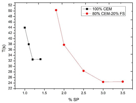 Such a test is required to consider the dispersing or deflocculating effect of the additives which lead to an increase or change in the compactness of the tested material [36,39]. The additive used was a high-performance superplasticizer Sika® ViscoCrete®-20 HE. The consequent additive ratio was established up to the saturation point of the additive, determined by means of a Marsh cone according to ASTM C-939 [40]. The flow time, and therefore the saturation point, varied depending on the addition used. The flow times of CEM I 52.5 R and of the silica fume cement slurry were determined in order to examine variation with and without addition, extrapolated to the behavior with other additions. The results obtained indicated, for 100% cement, that the saturation point is established at 1.2% in weight of additive for the mixture of 80% cement and 20% silica fume and the saturation point at 3% in weight of the additive. This can be observed in Figure 11. It can be seen how the mixture of cement with nanoaddition requires a larger amount of additive to achieve the same rheology.
