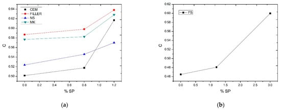 Once the saturation points of the additive were determined, the wet compactness tests were carried out, verifying the variation of compactness with the percentage of additive. Thus, for filler and metakaolin, maximum values of compactness were obtained—cFILL = 0.64, cFILL = 0.63 for nanosilica and cement values of ccem = 0.62, cNs = 0.55 for percentages in weight of additive of 1.2%. Silica fume compactness was cSF = 0.60 with 3% wt. of superplasticizer additive. Figure 12 shows the experimental compactness of additions according to the percentage of additive. The importance of the additive in obtaining the compactness values can be seen in this figure. Low additive contents lead to lower compactness values in the materials to be mixed. This directly affects the mixed compactness of the ensemble.